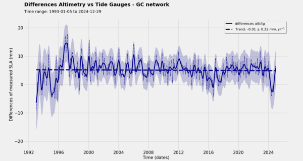 - Vertical Land Motion (VLM) correction: each trend difference is corrected for Glaciar Isostatic Ajustment (GIA) induced VLM, using Pr. Peltier’s ICE-5G(VM2) model (see Peltier 2004). Due to insufficient GPS data at the tide gauge locations over the whole GLOSS-CLIVAR or PSMSL networks, no correction is applied for the other VLM contributions.