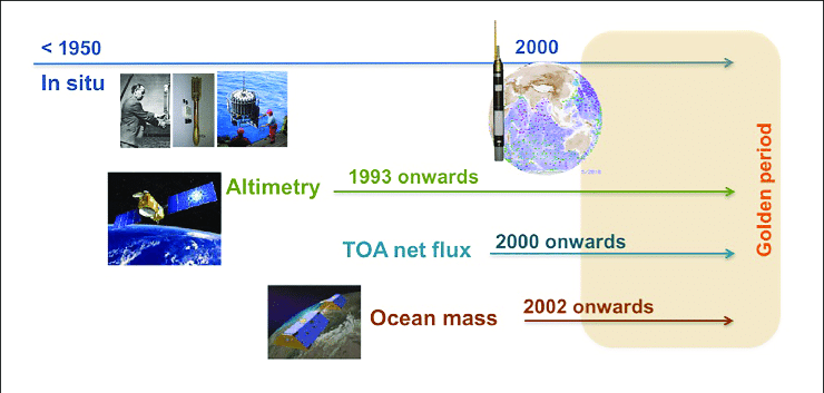 Evolution of in situ and remote sensing observing systems for the estimation of global ocean heat content. Top-of-atmosphere (TOA) net flux is derived from the CERES instruments. Ocean mass variations are observed from space gravimetry. (from Meyssignac et al. 2019).