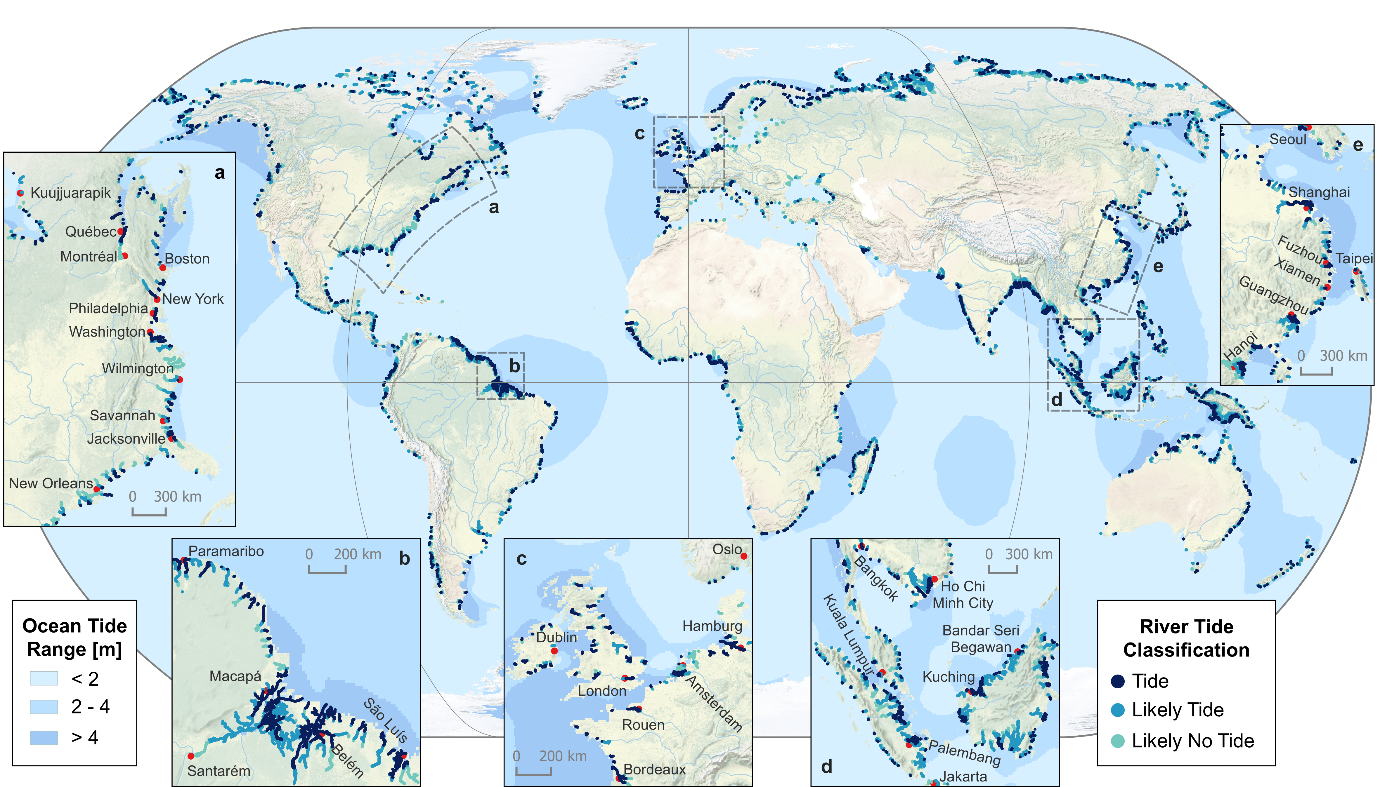 A study led by Michael Hart-Davis from the Deutsches Geodätisches Forschungsinstitut at the Technical University of Munich (DGFI-TUM) proposes a global characterization of tidal rivers wider than 30-90 m around Earth, using Swot river-dedicated products. The analysis reveals that tides extend for hundreds of kilometers in many rivers, even reaching about 900 km in the Amazon system - median being 161 km for the largest rivers, 13 km for the smallest. Another conclusion is that tidal extent depends also on slope and tidal amplitude at the river mouth. However, human-made infrastructures such as dams sharply decrease the tidal wave propagation up river.