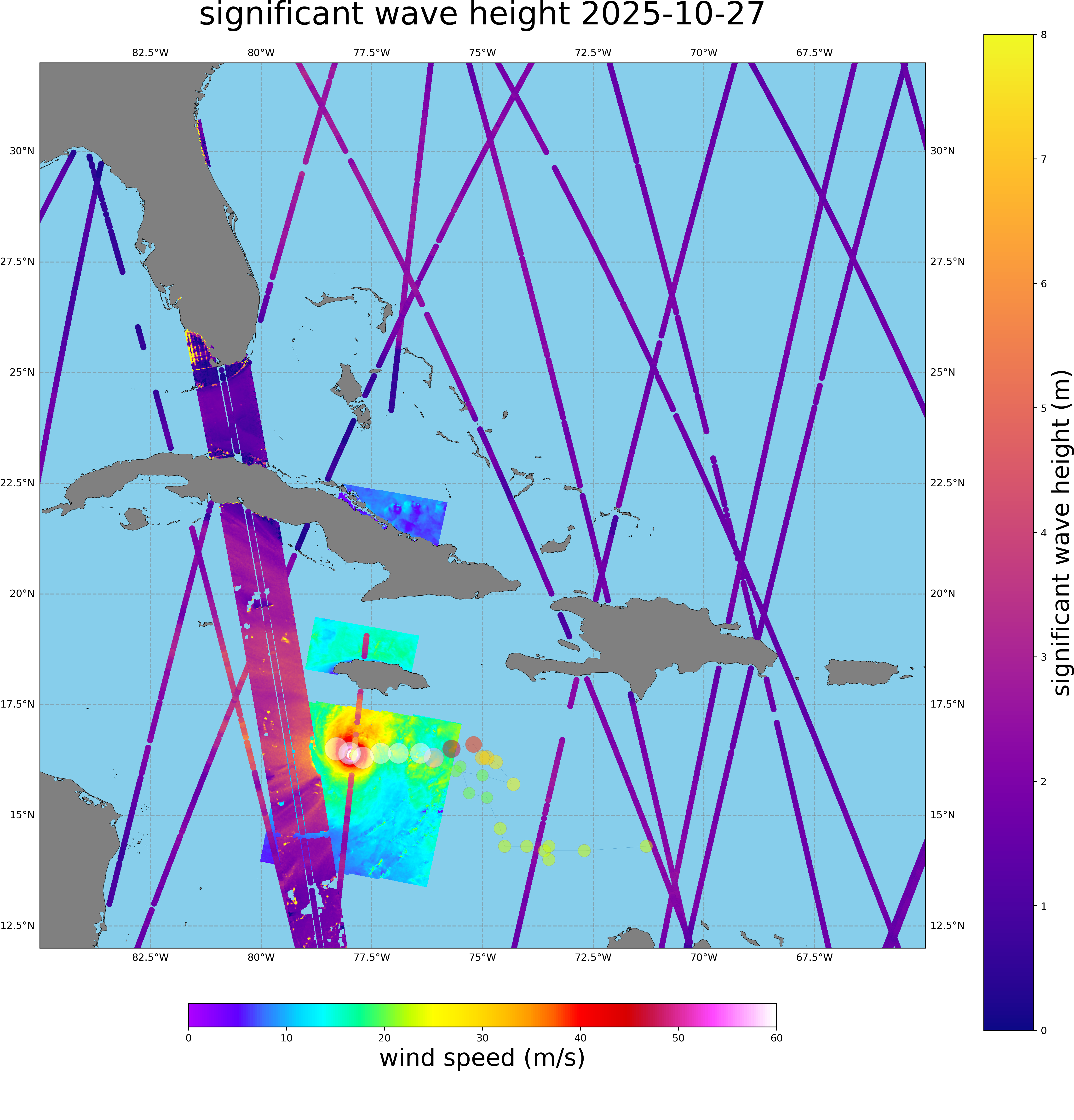 Sentinel-1 wind measurements reached 70 m/s (sustained wind, with stronger gusts) on October 27, when the hurricane made landfall in Jamaica.