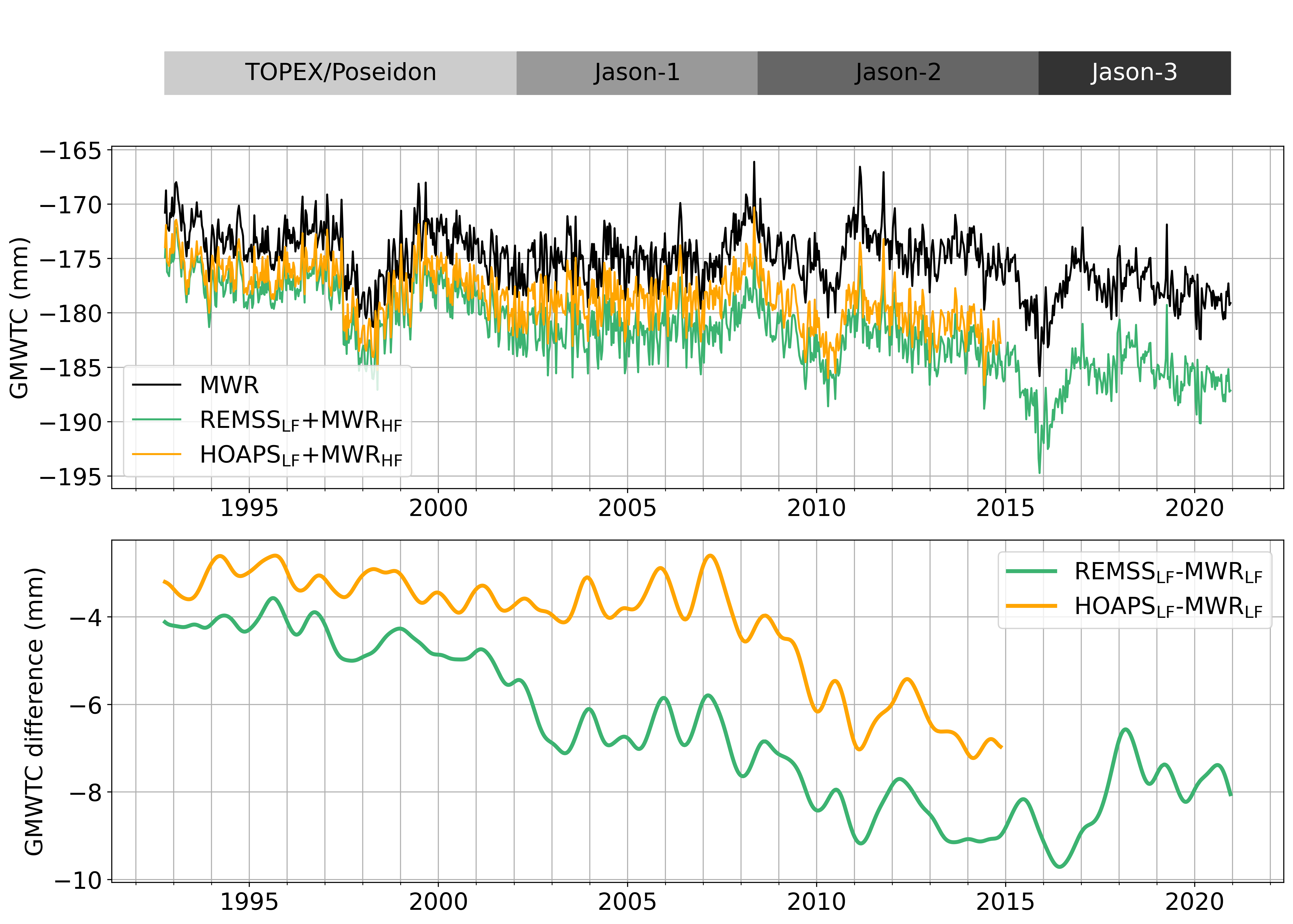 Atmospheric CorrectionWet tropospheric correction from water vapour climate data records In order to reduce the long term stability uncertainty of the GMSL, the WTC derived from highly stable water vapour climate data records (CDRs) from independent measurements on board meteorological satellites is proposed. |  |