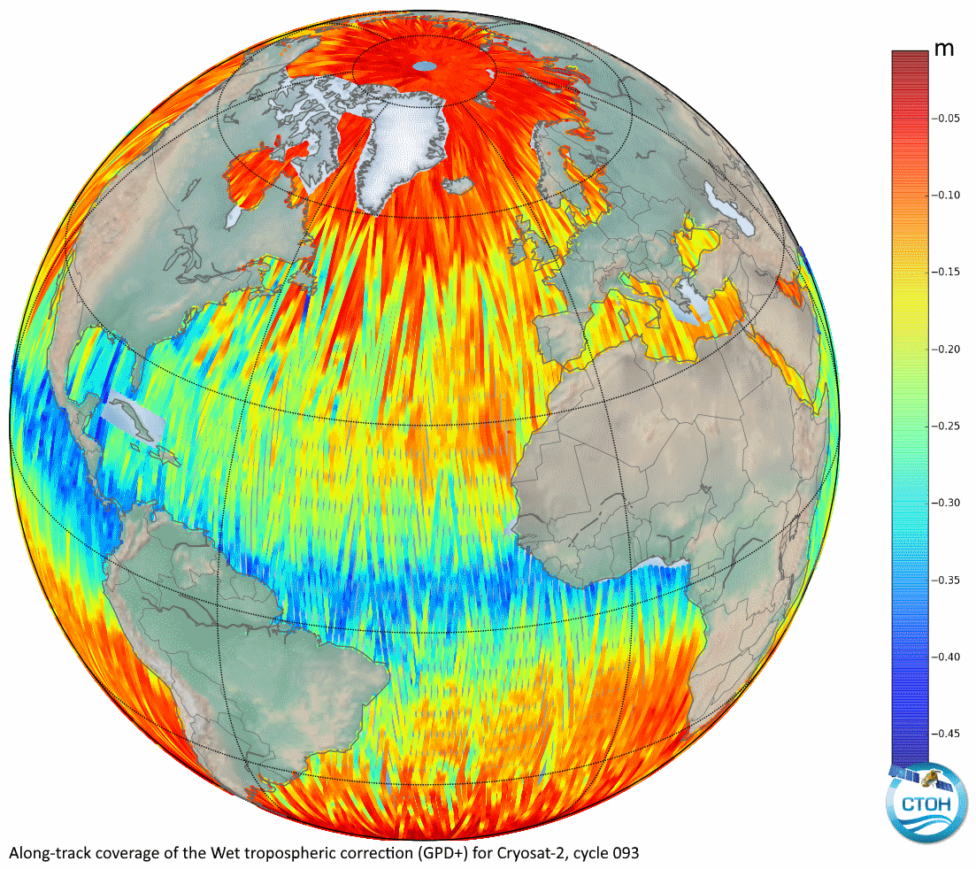 Atmospheric CorrectionGPD+ Wet tropospheric correction GPD+ dataset where the correction is computed by combining all available observations in the vicinity of the point: valid measurements from the on-board microwave radiometer, from Global Navigation Satellite System (GNSS) coastal and island stations, and from scanning imaging MWR on board various remote sensing missions. |  |