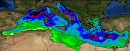 Mean Dynamic TopographySMDT2014-20Y_MED Mean sea surface height above geoid computed on a 20 years period (1993-2012). This sea surface height is specifically computed over Mediterranean Sea. |  |