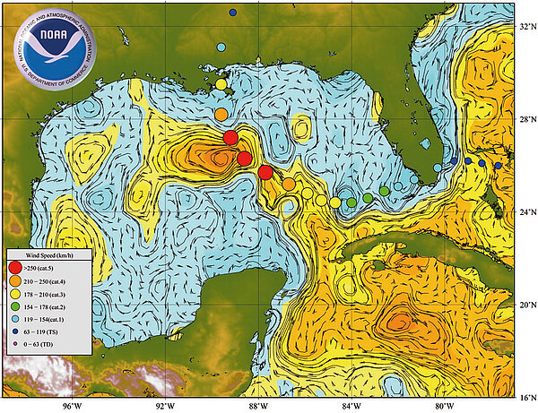 Ce sont des monstres essentiellement marins : ils exigent de l'eau à 26°C sur une épaisseur d'au moins 50 m et ce sur une grande étendue pour pouvoir se développer. Sur terre, ils perdent de leur puissance et s'étiolent, non sans avoir fait des dégâts. Un tel phénomène doit être suivi de près pour pouvoir alerter les populations. Pour cela, rien ne vaut les regards plongeant des satellites : vitesse du vent à la surface de la mer, nuages, hauteur des vagues, précipitations et température de surface de l'océan, sont mesurés par leurs instruments.